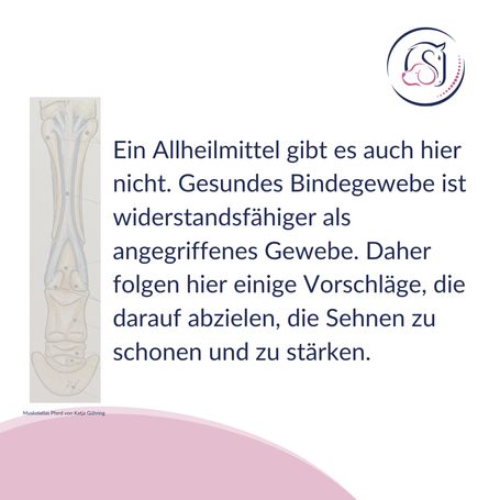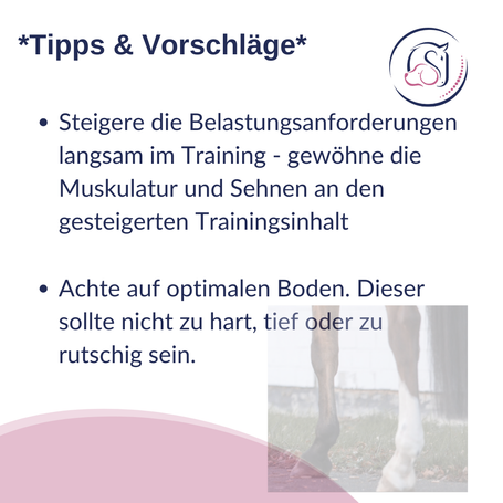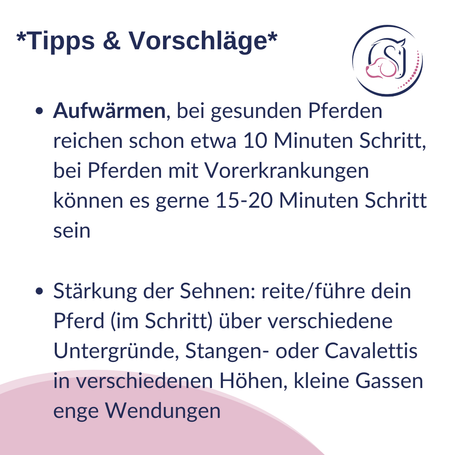 - Stärkung der Sehnen: reite/führe dein Pferd (im Schritt) über verschiedene Untergründe, Stangen- oder Cavalettis in verschiedenen Höhen, kleine Gassen enge Wendungen